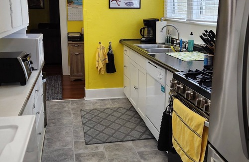 i've recently updated half of the kitchen with new cabinets, sink, countertop and added a dishwasher There is a new gas stove and newer French door fridge. If you continue past the fridge, you will find the washer and dryer for your use as well. Just past that, you will find the back door leading out to the rear porch. I've screened in the rear porch and it has a small bistro table with two seats. PLEASE NOTE - the back porch no longer has a screen door on it. I am in the process of having that replaced so for time being it's not fully sealed off. It's a great place to sit outside and enjoy the warm weather Off of the rear porch is the backyard that is fenced in.