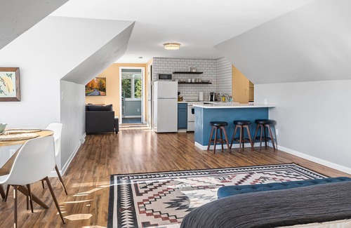 walk right past the kitchen, there sits a spacious dining table by windows looking out over trees - perfect for eating while taking in nature! past the dining area is our bright bedroom space configured with a large king bed On the other side of this space, there you'll find the living area with a "full" size sleeper sofa & flat screen TV tucked away in one corner; what comes next? Well just beyond it all is our full-size bathroom just waiting for its next guest.
