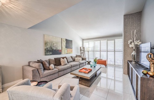 This peaceful midcentury modern gated townhome is located just minutes away from the Las Vegas strip and Harry Reid airport. The grounds include beautiful mature landscaping 2 pools and 2 hot tubs.The interior offers two private outdoor spaces with mountain views, washer and dryer. Wifi, and a fully stocked kitchen with dishwasher, microwave, stove..