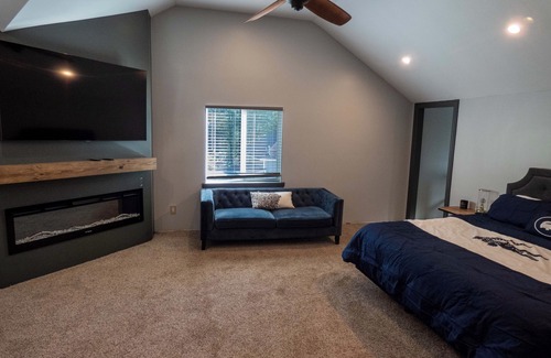 indoors you'll find a generous open floor plan with a massive farmhouse kitchen, pellet woodstove, and gas fireplace Upstairs the primary suite is a private escape with an electric fireplace, private balcony, and massive ensuite with jetted soaker tub.
