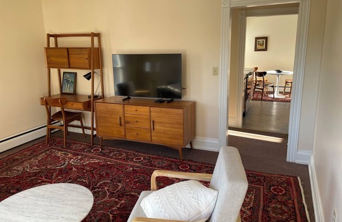 recently renovated and designed with a mid-century aesthetic, this upstairs apartment combines vintage elegance with contemporary comforts