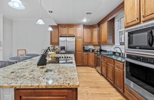 kitchen: fully stocked with oven, fridge, microwave, dishwasher, granite countertops, keurig, tea pot, and island