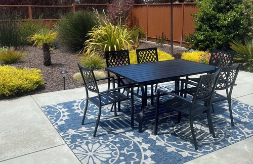 the house has a spacious shaded backyard with plenty of seating area The backyard is perfect for relaxation and soaking in the sun and to let the kids (or adults) run around.