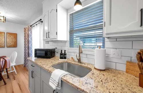 the kitchen has been updated with granite countertops, gray cabinets, and new appliances With cookware, pots and pans, dinnerware, a blender, mixer, mixing bowls, measuring spoons, and a microwave, you can prepare just about anything. Enjoy a nice cup of coffee with our Keurig Coffee Maker.