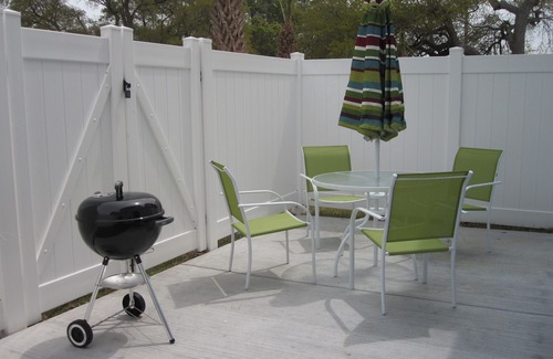-enclosed backyard with patio with a charcoal grill and table/chairs seating for four