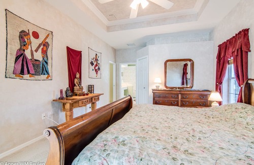 the master bedroom has a king size bed and a large walk-in closet Doors open to the solar-heated pool.