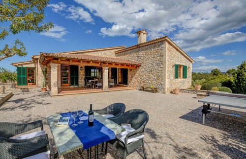 At a glance | Country house with pool | Plot approx. 7,000 sqm | Living space approx. 300 sqm | Occupancy 6 people in 3 double bedrooms and 2 bathrooms | Outside area: sun terrace, 6 loungers and outside shower, 10 x 5 m pool, covered terrace, alfresco dining area, charcoal grill | Fantastic view of the landscape and garden | Interior: living room, Sat TV (Astra), flat screen TV, fully equipped kitchen, three bedrooms and two bathrooms in the main house | Air conditioning in the bedroomsDetailed description | The country house Villa Marina is aprox. 4 km away from Pollença, the nearest beach is in Port de Pollença or Cala Sant Vicenç and can be reached in an aprox. ten minutes drive. Villa Marina is located nice and quietly in the middle of a 7,000 m2 property in the Marina area, near the Golf Pollensa. This typical stone villa is surrounded by a beautiful garden with palm trees and other typical autochton plants and has a wonderful view of the rural landscape.A country road leads to the entrance gate of the country house with a short driveway to the country house. In the well-kept garden there is the 10 x 5 m2 pool with eight sun loungers and a parasol. The covered terraces and sun terraces are fully equipped with garden tables and chairs (terrace on the main house), as well as a rustic table and wooden benches (terrace on the grill house). These covered and sun terraces on different levels inmidst a well grown garden make the outdoor space of this house quite unique.A rustic wooden door leads into the entrance hall. The sleeping area with three bedrooms and two bathrooms, one of them in suite is situated in the left wing of the villa. The fourth bedroom with shower room is apart in the annex by the pool / barbecue area. Villa Marina offers a spacious living area: the living room with a comfortable sofa and two armchairs, the fully equipped kitchen with its own dining area with a white colored solid wood table and seating for up to eight people. From the living and dining area you step out to the covered terrace with another solid wood table and seating for up to eight people. In front of the covered terrace there is the large sun terrace with a ping pong table. We continue over a few steps to the pool with eight sun loungers and an outdoor shower. The barbecu area next to the pool offers another small covered terrace with a solid wood table with two benches, that invites you to enjoy a cozy barbecue by the pool. Only on request: additional bedroom and shower room in the annex, it is a simpler than the areas in the main building.All bedrooms have air conditioning, there is no air conditioning in the living area, two mobile fans are available.You also want to stay up-to-date while on holiday, the Villa Marina has wireless internet access and satellite TV (Astra Sat).General aspects | One of the nicest things about the houses in the South is simply that you can spend hours outdoors. Is there anything better than starting the day with a breakfast on the terrace, basking in the sun during the day or basking in the shade under a palm tree, then ending the day with a leisurely barbecue with a glass of wine after a refreshing shower to let. The covered terrace is perfect for the latter and defies all weather conditions. And on balmy summer nights you can sit on one of the exposed terraces to enjoy the Majorcan starry sky. Area | 'Marina' is the toponym of the area in which the country house is located. The area is known for its particularly quiet location. The property is located on an old road between Port de Pollença, Golf Pollença and Alcudia. The road branches into other smaller paths, ideal for walks, jogging and cycling. Nevertheless, the proximity to Pollença gives you the opportunity to immerse yourself in the hustle and bustle of the busy village life..