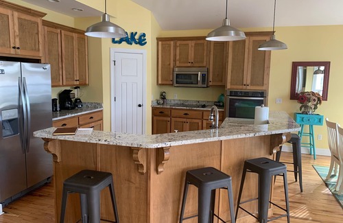 This 3 bedroom, 2 bath home is located on Cowan Creek at Weiss Lake in Northeast Alabama. The fully furnished home features spectacular views of the lake and surrounding mountains. Cowan Creek is a favorite location for wake boarding, kayaking, paddle boarding, water skiing, and fishing. The master bedroom is furnished with a queen size bed. There are twin beds in each of the other two bedrooms. And, there are twin beds in the loft. The great room also has a sleeper sofa. Towels and linens are provided. The kitchen is fully furnished and there is a washer/dryer in the laundry room. The home also has internet access (wifi), high-definition satellite TV and DVD player. There is a parking pad for a boat trailer or small RV and adequate parking for two additional vehicles in the driveway (garage is used for owner storage and is not accessible). The home has two exterior security cameras and one interior camera (which can be turned off for privacy).. The deck has adirondack chairs, and table with chairs. A gas grill is also available. There is a concrete walk down to the dock which has a power outlet for boat charges or other equipment and a fish cleaning station (the dock does not have lights). There are chairs on the dock. Located on a natural point, the dock is a great area for swimming, with a ladder provided. In addition to the deck off the back of the house, there is a sitting area closer to the lake with a pergola and incredible views of the lake and surrounding mountains. Boats can be launched nearby at Cowan Creek Resort or Roosters; both are less than one mile away. There are many scenic areas and trails nearby, most notably Little River Canyon National Preserve and Cherokee Rock Village. Canoe and kayak trips on Terrapin Creek is also a popular nearby outing. There are two nesting pairs of Bald Eagles on Cowan Creek; Herons and Egrets are common sightings along with other water fowl. Migrating pelicans can be seen on the lake from late October into January..