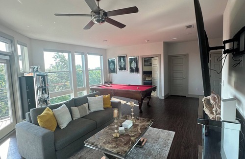 Unwind in Houston at this lovely condo. This brilliant property features 2 cozy bedrooms - one with a queen bed and the other with a king bed. You'll also find 2 bathrooms with convenient amenities like a hairdryer and a shower. Plus, there are 2 additional living spaces with a sofa and an air mattress for extra comfort. We think our place will help you experience everything Houston has to offer. Just minutes away from Downtown Toyota Center, Minute Maid Park, NRG Stadium. Within walking distance from the acclaimed Galleria mall. When you’re planning your next trip check out this one of a kind suite you won’t be disappointed sleeps up to six. Luxury amenities from swimming pool, pool tables, meeting and conference room space. Outdoor sitting area. Many amenities to enjoy during your stay!.