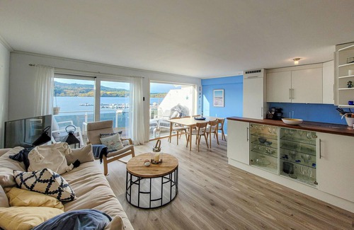the light-flooded apartment welcomes its guests in a beautiful location by the glittering bjørnafjord Inside, the combination of the summery colors white and light blue conveys the closeness to the sea. Whether you are cooking, eating or playing cards in the open plan living kitchen, you can always see the fjord through the large panoramic windows. Go out to the beautiful terrace with excellent views of the fjord and the small marina and relax in the lounge furniture after an eventful day. There is a restaurant in the same building and good fishing opportunities from the land.