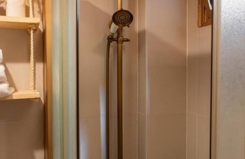 living space with a double bed, open closet, kitchen equipped with the basics for cooking and vintage bathroom with shower