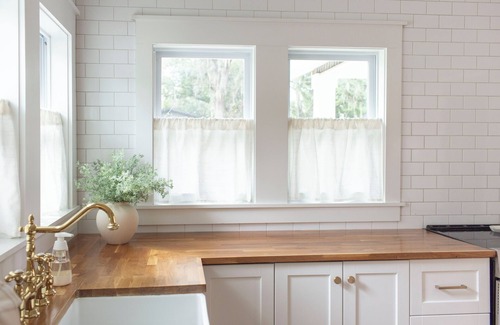 enter into the open concept living space and you’ll be greeted by original heart pine flooring and a lovely white brick fireplace (she’s just for looks) Layered shades of white on the walls and furnishings, paired with ample windows, creates a bright airy space that’s full of charm and natural light. A plush, deep sofa with brushed cotton slipcover is the perfect place to relax after a long days work, or curl up on with a good book on a rainy summer evening.