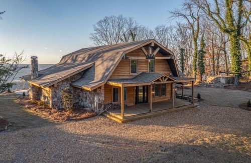 the amazing outdoor living space is so relaxing and peaceful The minute you arrive at Tarbucks Hill, relaxation sets in. The cabin boasts a beautiful front porch complete with rocking chairs. It offers a pool and hot tub overlooking the brow. There are two outdoor fireplaces one on the covered back porch. There is a small playground for the kids to enjoy. You will find plenty of outdoor seating for relaxation with views and sunsets that will make you never want to leave.