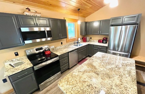 discover the perfect blend of comfort and functionality in this home, showcasing a spacious great room with a combined living, dining, and kitchen area, complemented by a wood-burning fireplace Additional highlights include a lower-level family room, 4 generously sized bedrooms (2 on the main level and 2 on the lower level), 2 full baths, in-unit laundry, and a private driveway. Each bedroom is furnished with a queen bed, dresser, and TV for added convenience and enjoyment.