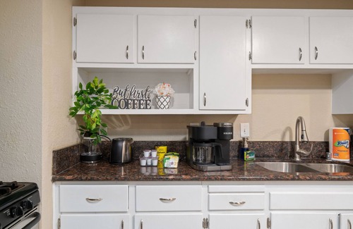 - kitchen: coffee maker, k-cup coffee machine, toaster, oven, microwave, fridge, dishwasher, cookware, dishes, glassware, utensils, oil, salts, and peppers