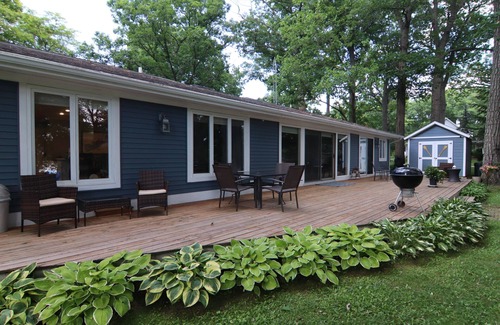 Forget your worries in this spacious and serene space, surrounded by mature trees, namely large oak trees. This ranch-style home offers comfort with its electric fireplace and beautiful views of Green Lake. The wraparound deck and patio space provides plenty of room for relaxing and entertaining. This modern home has an open-concept feel. It is also near a public boat landing and local golf course. Not to mention within walking distance of downtown- with restaurants, marinas, and boutiques. Whether you're exploring the beautiful surroundings or simply unwinding indoors, we think our place will help you experience everything Green Lake has to offer..