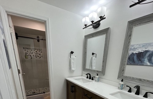 the bathroom first greets you with a newly installed double-sink vanity with a surplus of storage stocked with towels and marble countertop space for each side Further inside, the tile walk-in shower and soft-close toilet lie behind a lockable door for privacy from bathroom vanity users. The walk-in shower has a corner stone-top seat as well as a built in convenience shelf for positioning any shampoos, conditioners, etc.