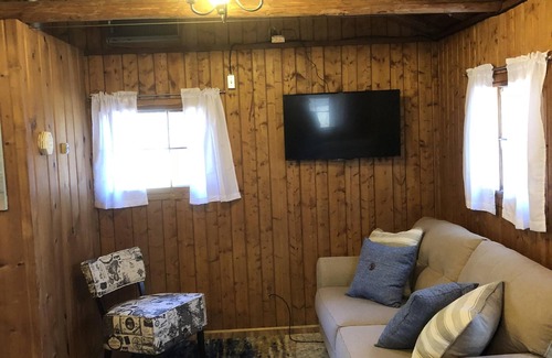 cabin 1 is referred to as "sailing," and sleeps 6 The cabin is roughly 400 square feet, with an open floor plan. The main sleeping area sleeps 2 on the double bed and two in the bunk beds, with queen sofa sleeper, accommodating 2 more. The living room features a sofa, chairs, and flat screen smart tv. The cabin has an updated bath and a fully equipped kitchen. The rental also provides access to paddle boats, kayaks, and paddle boards, as available. The cabin sits on a couple of wooded acres on the lake, providing waterfront, woods, and access to beaches and the pier.