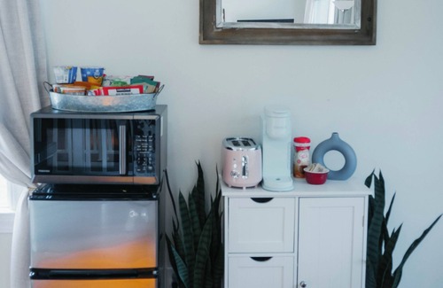 the second floor contains the kitchenette, full bathroom with walk in shower, dining area, living room with smart tv and bedroom area with clothing storage available