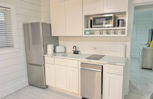 welcome to happy place, a cozy ground level one bedroom one bathroom studio is bright and has shiplap throughout after being recently updated Located just 0.4 miles from the white sandy beaches of the Gulf of Mexico. surrounded by tropical landscaping. This bungalow has all the essentials for a fabulous vacation. There is a kitchenette with stainless steel fridge, hob & microwave and dish-ware. There is a bistro table set for two guests. After a long day of fun at the beach and watch your favorite show on the large flat screen TV and fall asleep to the sound of the nearby palm trees swaying. The bedroom has a smart TV and King bed with Tuft & Needle mattress, the bathroom has a walk-in shower.