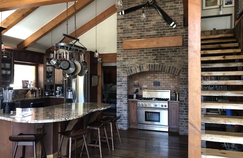 overlooking a year 'round babbling creek, this mountain retreat will surround you in natural beauty while giving comfort, joy, and awe Sweeping views of the hillside and creek set the mood in the great room. The wall of windows provide warm light for gathering at the dining table and lounging on the large sectional. Luxurious finishes include a chef's kitchen with corner farm-sink, granite counters, plus commercial range and hood. Details like locally harvested, reclaimed barn wood, soaring beams, and rich walnut doors & trim compliment the native setting. There’s also a wood-burning stove providing both warmth and ambiance.