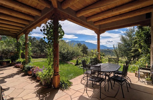 Luxurious 4300 sq ft Passive Solar, 5 Bedrooms: 3 bedrooms with queens, 1 king Mega Suite with ensuite bathroom, walk-in closet, private entrance to private patio and direct hot tub access. 1 Bedroom with bunk beds. Large tropical indoor greenhouse off of kitchen with futon, as well. Spacious living room, dish washer, washer and dryer, chefs kitchen with brand new refrigerator, viking range, high ceilings, radiant heat, passive solar is warm in winter, cool in summer, indoor and outdoor rock walls, terraced organic vegetable and flower gardens, Saltillo tile throughout, 3 brick and flagstone portals with unbelievable views, large shade trees, 15 min to ski lifts, 15 min to plaza. All wheel drive mandatory during ski season..