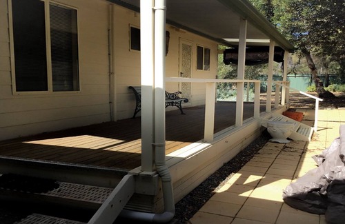 this simple home is set in a tranquil well established garden with many shady trees and lots of birdlife The house has a comfortable, air-conditioned open plan living with lounge, dining and kitchen.