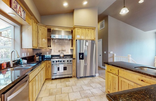 your custom-built, two-story retreat features lovely bathrooms, granite details, and custom cabinetry The chef in your group will appreciate the gourmet kitchen, decked out with stainless steel appliances and a professional Viking stove.