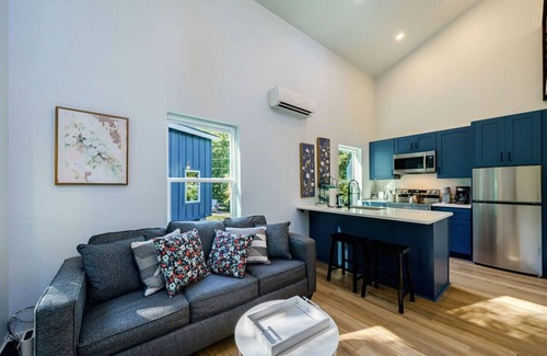 the space in magnolia tree tiny home is designed to accommodate up to 4 people There is a king size Sealy Posturepedic bed with luxury linens in the 10' x 10' loft upstairs. There are also two nightstands and several outlets/USB charging ports in the loft. In the main living space, the sofa pulls out to a queen size bed with a Sealy sleeper sofa mattress. A cozy chair in the reading nook is the best place to curl up with a book. Our smart Toshiba Amazon Fire TV is on a rolling cart, so you can move the TV wherever you like in the house. Fresh linens including blankets and pillows for the sleeper sofa are stored in a plastic case in the laundry closet. The open kitchen includes a stainless steel refrigerator/freezer, stainless steel oven/stove, stainless steel dishwasher, microwave/vent hood, double sink, toaster, Keurig and traditional carafe coffee maker. In the cabinets you'll find a set of plates, appetizer size plates and bowls, in addition to a plastic set of dishes, coffee cups, glasses, stemware, cutting mats, mixing bowls, bakeware, knives, cooking utensils and cutlery. We provide coffee pods, mini vanilla creamers, stevia and sugar packets. The bathroom includes a large tile shower with a rain head shower fixture, European shower wand and sliding glass door. The vent fan/light in the bathroom over the shower is a Bluetooth Speaker. connect to homwerks and listen to your favorite music or podcast while you’re taking a nice hot shower!