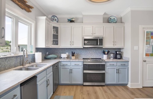 this beautiful home is located on a cul-de-sac -- just a few minutes walk from the private community beach, swimming pool, tennis courts, and playground Kids and adults alike will enjoy the ground-floor game room which has a snack kitchen and is adjacent to the outdoor living space with gas grill and outdoor dining area and deck overlooking the dunes. The ground-floor also features a queen bedroom and bath. The main floor is the main gathering area. The spacious dining table is ideal for family meals and games; and the comfortable living area is adjacent to the screened porch and open kitchen. A queen bedroom has private access to the shared hall bath and a bunk room with two sets of bunk beds completes this floor. The third floor features a newly decorated king (Tuft and Needle mattress) bedroom with private screened porch access and beautiful views, a queen bedroom, and a shared hall bath. we also provide a porta-crib, please bring your own sheets for baby!