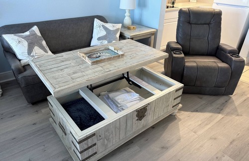 “a room with a view” This 3'rd floor oceanfront suite is located at the Daytona Beach Resort. The private balcony offers gorgeous views of the Atlantic Ocean. Enjoy a warm cup of coffee along with the beautiful sunrise. The Condo features a King bed, sofa, power recliner, and 50” smart HDTV. A full-sized dresser and two nightstands offer plenty of storage space for your belongings. The kitchen is equipped with a full-size refrigerator with ice maker, microwave, solid surface stove top, coffee maker (traditional 12 cup pot/single serve K-Cup combination) a toaster, and a large sink. We supply a variety of pots, pans, utensils, dishes, cups, silverware, etc. for your cooking and dining needs.