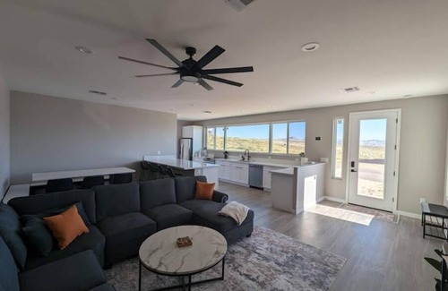 Relax with the whole family at this NEW peaceful Lake Powell getaway. Equipped with outdoor patio + hot tub, large rooftop deck, 40 ft garage for boat and jet ski storage, and astroturf for your pets. This stunning home with immaculate views of Lone Rock and the Utah-Arizona desert sleeps 8+ with 4 BR/3 BA. Boating on the lake, hiking, and many other outdoor activities/attractions just minutes away..