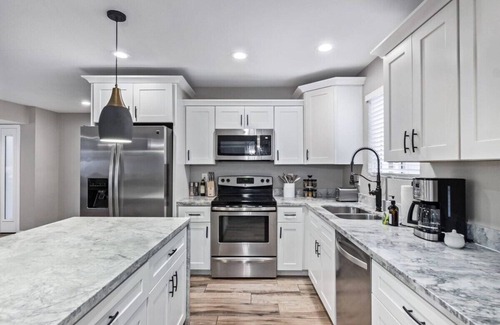 immerse yourself in nearly 2000 sqft. of modern comfort. Enjoy the open-concept living, dining, and family spaces with plush seating, two fireplaces, and a 65" Smart TV. The gourmet kitchen features state-of-the-art appliances and a chic island. Relax in three curated bedrooms, including a primary sanctuary with a King bed and en-suite bath. The secluded backyard offers a heated patio, pool, mini putting green, and gas firepit. Experience pure relaxation and entertainment in this dream oasis.