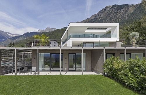 the view is characterized by simple elegance, clear design and luxurious living atmosphere in the best location The apartment 'suite WHITE' is facing south with a view of the Merano countryside and has a large terrace with private garden. The frameless window fronts made of glass combined with high-quality materials provide an open feeling with a unique living experience. The transitions between interior and exterior disappear. The salt water infinity pool with a panoramic view of the surrounding mountain scenery rounds off the feeling of freedom. Overall, a lifestyle residence that meets the highest expectations and makes your holiday special.