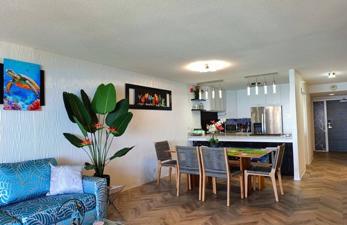 new open-concept modern kitchen with stainless steel fridge, microwave, and dishwasher 2 bathrooms with Bluetooth-enabled music speakers. Centrally located and within walking distance to top-of-the-line shopping and attractions. Vacation in style and let your stresses melt away. Embrace Aloha the way it was meant to be; where luxury meets paradise.