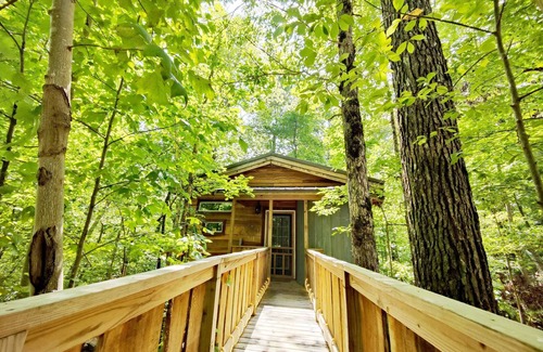 nestled on 30 acres of monteagle mountain’s wildlife-rich "bio-gem," the dove treehouse at terralodge is your ultimate treetop escape! freshly revamped with sleek furniture, a top-rated nectar king memory foam mattress, and cutting-edge tech, it boasts blazing fiber wifi, stellar cell reception, cable, and a smart tv with soundbar for netflix or hulu marathons Stay cozy by the gas fireplace or step onto your private covered porch for coffee in the saltwater hot tub or lounging in a double-wide hammock with epic forest views.