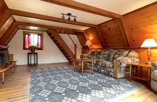 the a-frame home itself offers two bedrooms and one bath and a fully equipped kitchen! the first bedroom offers a queen size bed and is on the main level The second bedroom is located upstairs and offers a twin trundle bed, perfect for families! Relax in the comfortable living room with a smart tv. The dining room has space to gather along with the breakfast bar in the kitchen, where meal prep is a breeze! A washer and dryer are available for your convenience.