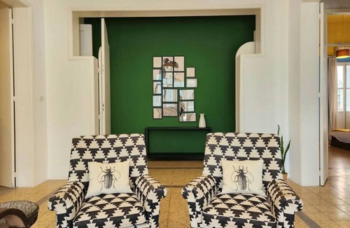 this restored apartment is located on the second floor of a typical old lebanese house, with high ceilings and large windows that let in a lot of natural light and ventilation, perfect for beirut's warm climate It has a spacious common area, furnished and decorated in a chic and charming style, with a comfortable vintage L-shaped sofa, arm chairs, a coffee table, round dining table and lots of plants.