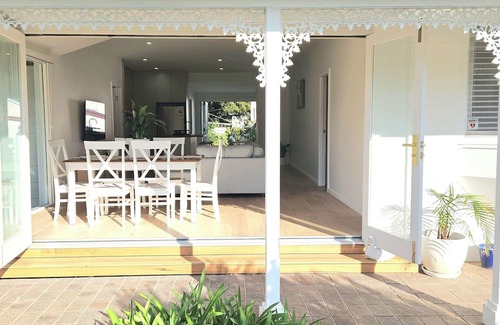 with bi-fold doors at the front and back, you can open the house right up and enjoy a refreshing sea breeze or a view that stretches from the front yard all the way through to the lush, landscaped backyard