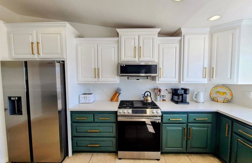 the enormous kitchen has room for multiple chefs to operate simultaneously! fully stocked with sauce pans, non-stick skillets, baking sheets, muffin molds and an immersion blender, our kitchen invites you and your group to collaborate on gourmet meals and treats Start your morning watching the sunrise on the mountains while you prepare your coffee (Keurig, drip or pour-over) or tea (electric kettle).