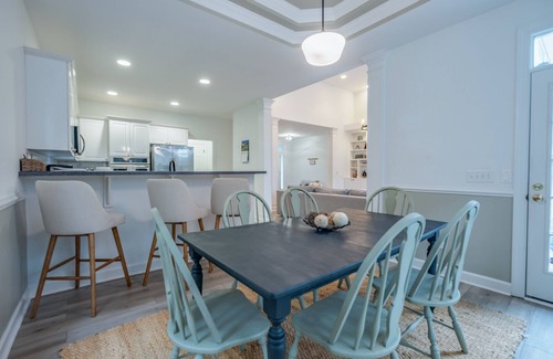 this 3 bedroom 2 bathroom home has been recently remodeled with new flooring, furniture and fixtures, high speed wifi of 600 mbps,4 large smart tvs, laundry, drip coffee machine, cooking essentials, wine glasses and comfortable high- end home furnishings There is a dedicated workspace in the master bedroom.