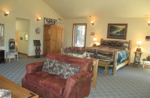 This private studio/suite has lofty views of the forest, gardens and the Feather River Canyon. There is a trail for hiking or mountain biking access to the river for fishing, swimming or rafting. Your accommodation is an 1100 sq ft. suite with high vaulted ceilings and wood beams and is privately situated on the east wing of the owners home. The access is B & B style into a large foyer and up a log staircase and over to the private east wing of the owners home. Restful sleeping is yours with the queen sized log bed and there is a small en suite with a double futon bed. The spa sized bath has a spa tub and separate walk in shower. The bath counter top is granite with 2 copper sinks. Includes Direct TV, full sized coffee maker, mini refrigerator & microwave. French doors access a balcony/deck with bistro table & chairs to enjoy the sound of the Feather River and wildlife sightings while you sip on your morning coffee or relax at the end of the day with a glass of your favorite beverage. There are restaurants, shops, golfing, lakes, gas station, stores & post office within 1 to 15 miles away. Please feel free to contact the owner with any questions..