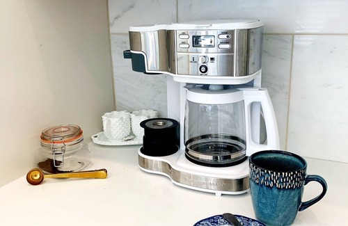 out the sliding glass doors on the lower level you'll find our private side courtyard garden area, perfect for drinks or a snack Seating for four on the front porch allows you to have your morning coffee or tea (the cottage is stocked with both, and creamer and sugar, too) and watch the walkers stroll by. We have one bike available for your use, and more can be rented at the bike shop, a short walk from the cottage.