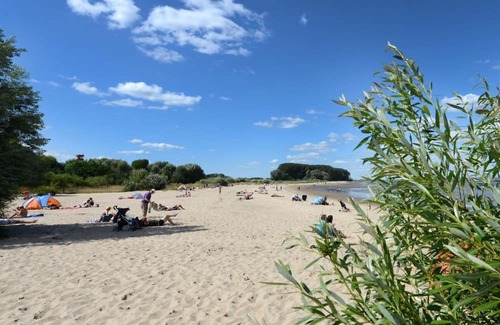 comfortable holiday apartment on the elbe island of krautsand near the old country and stade! there are space for up to 6 guests in 2 bedrooms, 1 bathroom and 1 living/dining room with open kitchen The highlight is a direct view of the Elbe. The apartment is modernly furnished with great attention to detail and is on heromestone in the newly built Elbe beach Resort. The apartment is located directly on the long sandy beach and the Elbe.