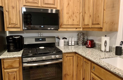 the modern full-size kitchen is fully stocked with all pots, pans and dishware includes coffee maker air fryer, and much more Everything is brand new and super clean! The large dishwasher makes clean-up a breeze and the washer/dryer make longer stays more convenient. Central A/C and Heat keeps away the summer heat and chill of winter. Although, with four mild seasons often barely used.