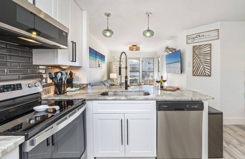 the emerald gem is a cozy & absolutely stunning modern condo, recently renovated in 2023 in the sought after sandpiper cove resort Enjoy amenities, amenities, amenities! Start with a cool beverage of choice right outside your bedroom door or a meal at the picnic style table on your large private patio overlooking the grassy area, horseshoe pits & pool area. There is plenty of space to cook in and eat in the A/C in the newly remodeled kitchen with high-end granite countertops and a breakfast bar with seating for 4. Relax on the soft leather sofa that converts to a queen size bed with memory foam mattress for sleeping. Watch movies, play board games and visit in the living area that overlooks the large deck through the windows. snuggle up in the intimate bedroom on a queen size bed with patio door that leads to large outdoor space, and let the kids enjoy the built in hallway twin bunks!