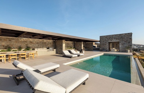 the villas luxury outdoor lounge and dining area, along with a seamlessly integrated pool, stylish furniture, and breathtaking views, create an idyllic setting for relaxation and entertainment Environmentally-conscious design elements, such as sustainable materials, electric car chargers, and renewable energy sources, demonstrate our dedication to preserving Mykonos natural beauty and cultural heritage.