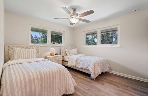 bedroom 1: king bed Bedroom 2: Queen bed. Bedroom 3: 2 twin beds. All bedrooms have cable tv and live streaming ability. Sofa bed in family room. 2 completely remodeled full baths. 2 family rooms and 2 dining room tables. plenty of room to entertain!