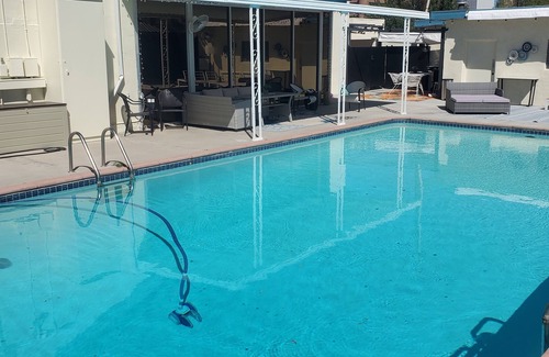 the huge old school swimming pool, original patio cover takes you back to 1950's vegas, and new automatic awnings to give you sun or shade at the push of a button