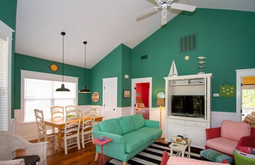 Firefly Shack, as this charming cottage is named, is truly the ultimate beach/golf get-away. Firefly symbolizes that small simple things bring light! It is truly a one-of-a-kind gem. Featuring 2 bedrooms, with 2 queen size beds in one room and 2 full size beds in the other, both with en-suite baths. The vibrancy of this cottage will make a happy place for all. Enjoy the screened in porch, complete with rocking chairs and ceiling fans. There are 3 Smart TVs, all of which have the Sports Package, so you won't miss out on any of your favorite games! A charcoal grill is available for your favorite BBQ meals and enjoy the chairs provided to chat with family and friends while cooking and taking in the scene of the Ocean Creek Golf Course. You'll probably see a deer or two! This cottage is located on the infamous Davis Love Drive, where all houses/cottages back up to the golf course.